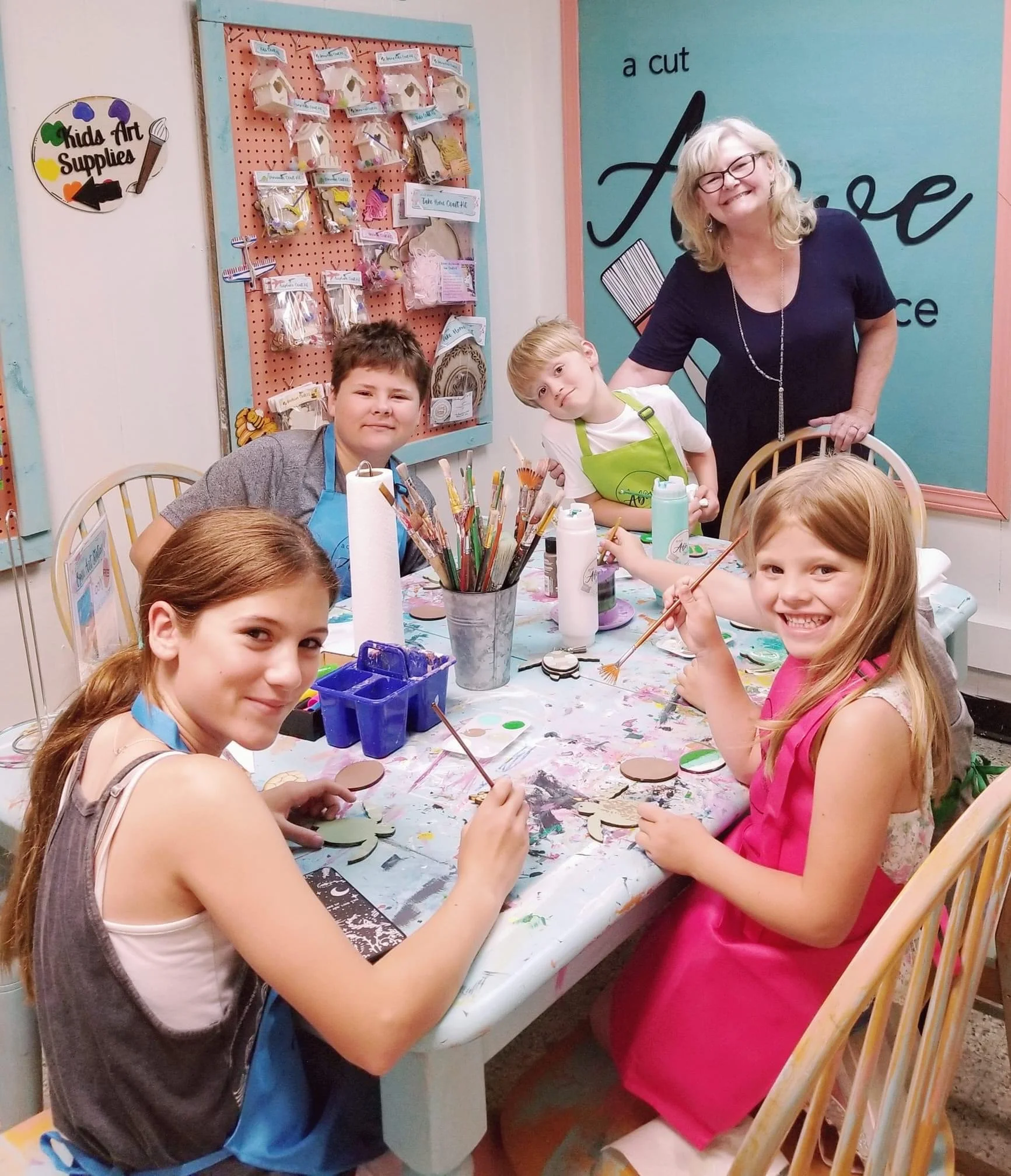 We offer an unique and wonderfully creative birthday party experience for children ages 4 and up. Our studio can comfortably accommodate ten children with a few supervising adults. Please complete the Birthday Party Inquiry Form and we will respond with custom project ideas for your event. Pricing is calculated by multiplying the price of your chosen project by the number of participants you have in your party. Popular party projects include candles, wooden door signs, stuffies, slime, bath bombs, and canvas paintings. A minimum of $250 spent on projects is required to host a private party. Party blocks are reserved for 1.5 hours (this does not include set up or clean up). We do not provide decorations or food, but you are welcome to bring your own.