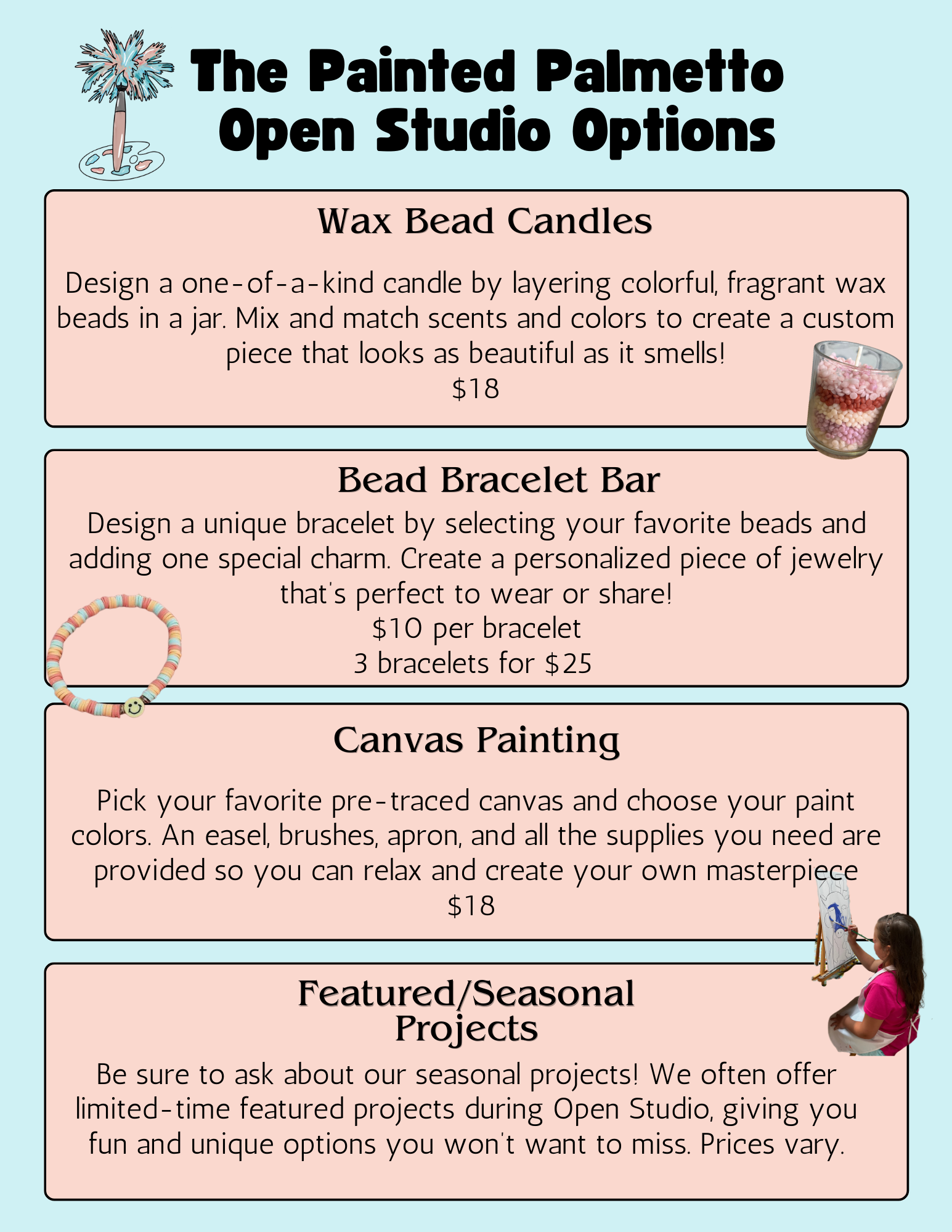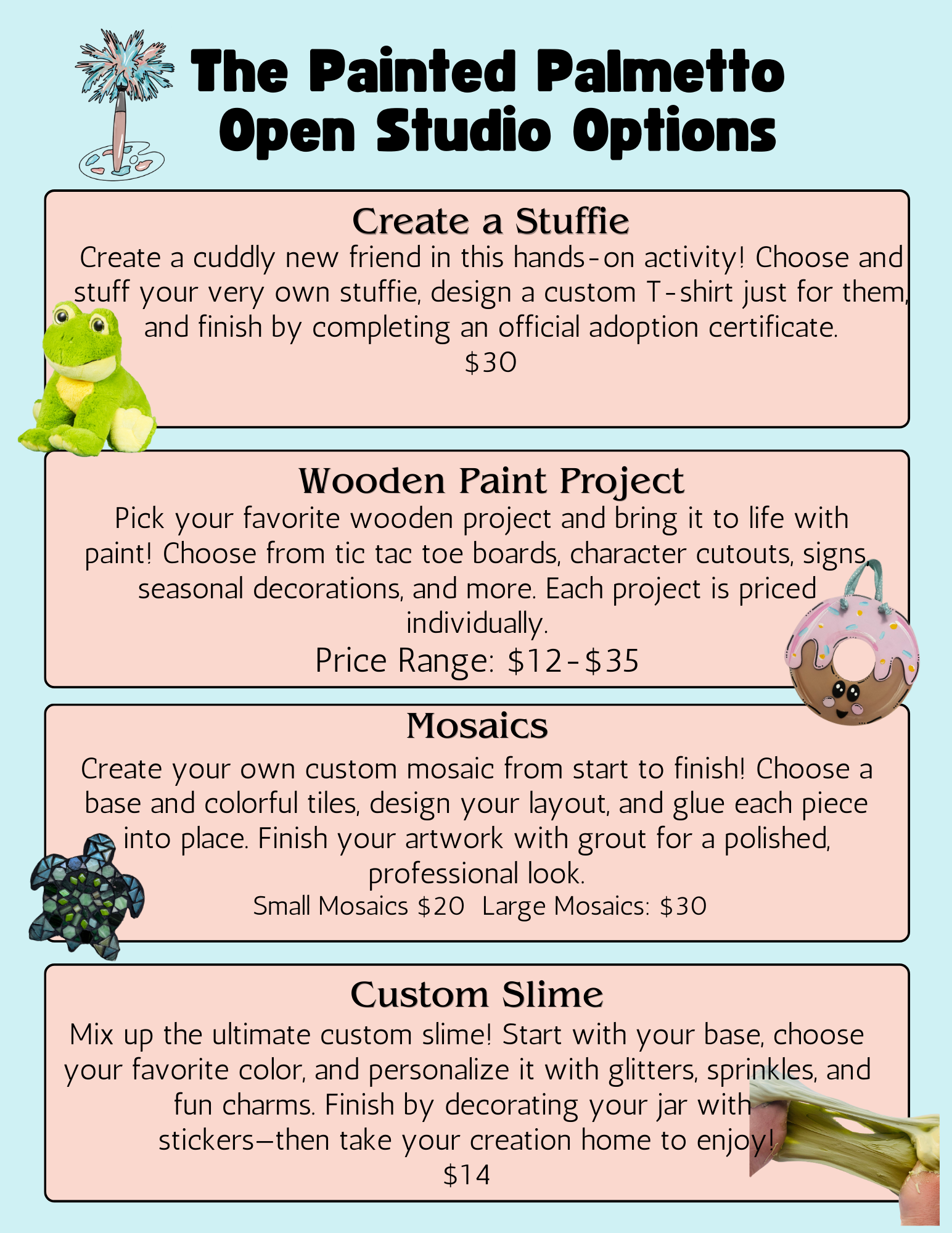 Drop in during our Open Studio hours and get creative—no appointment needed! Choose from a wide variety of fun, hands-on projects including wooden paint crafts (like door signs, character cutouts, and tic-tac-toe games), stuffie making, custom slime, candle making, and our popular bead jewelry bar. Come anytime and make something magical!